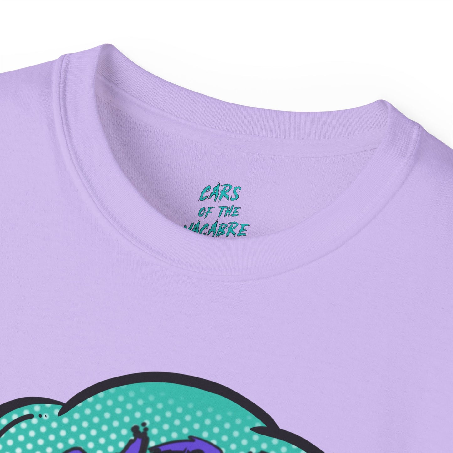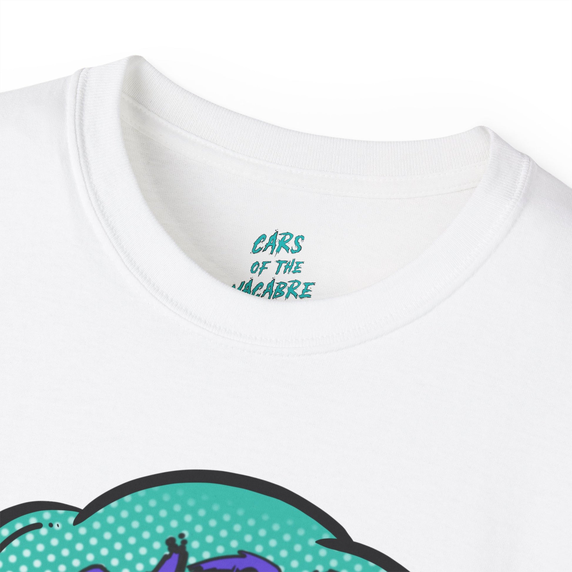 Introducing our unisex Cars of the Macabre speech bubble graphic cotton tee, a must-have addition to your spooky wardrobe!